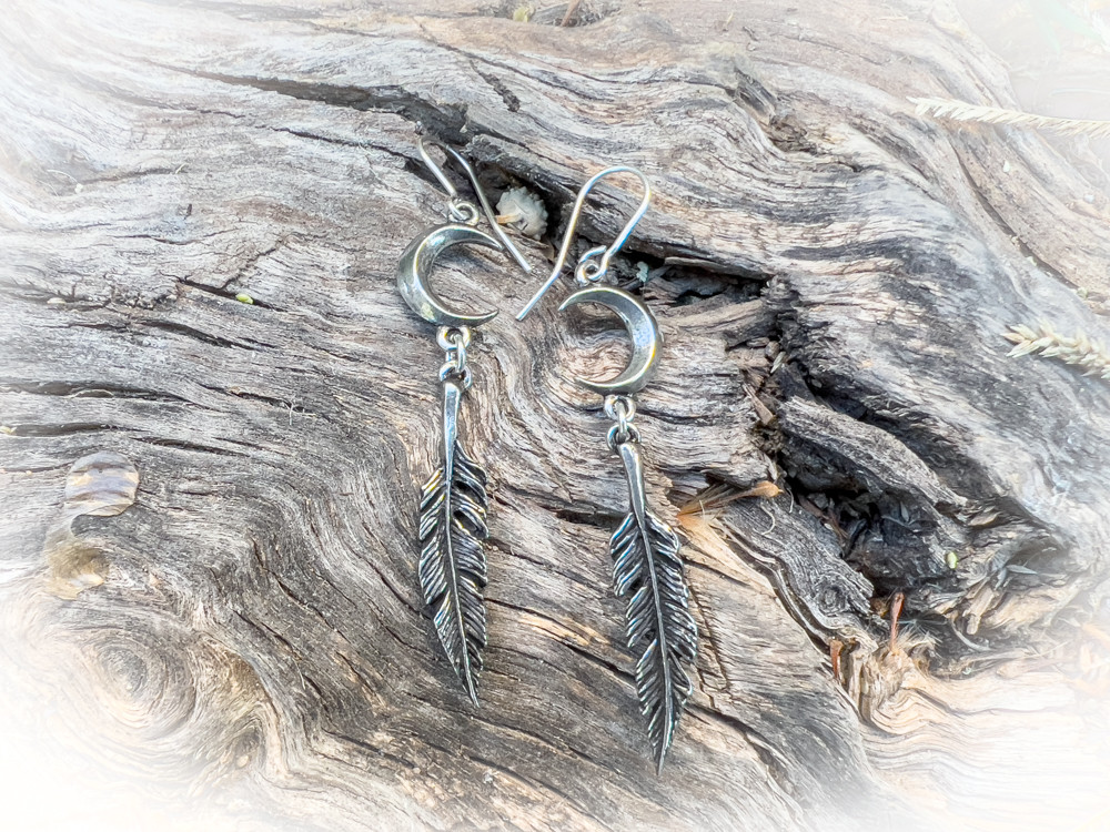 Дизайн серег включает в себя подвески в виде месяца/полумесяца, перьев и геометрических фигур. Тематика готики и символики придает украшению особый шарм и загадочность.