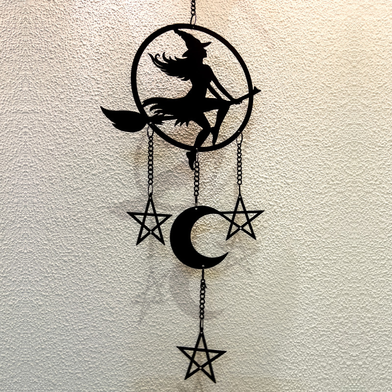 Стилизованная ведьма летит над луной, окруженная полумесяцем и колдовскими пентаграммами. Это дерзкое подвесное украшение станет ярким акцентом в вашем интерьере.