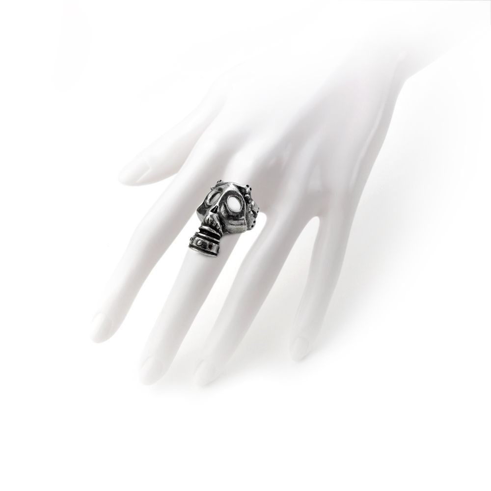 Кольцо Asphyxia. Аутентичная копия немецкого противогаза времен Первой мировой войны: со стеклянными линзами. Кольцо из английского пьютера. Изделия в индивидуальной фирменной упаковке, включающей гарантию и инструкцию по уходу. Разработаны и изготовлены вручную в Англии из английского пьютера.