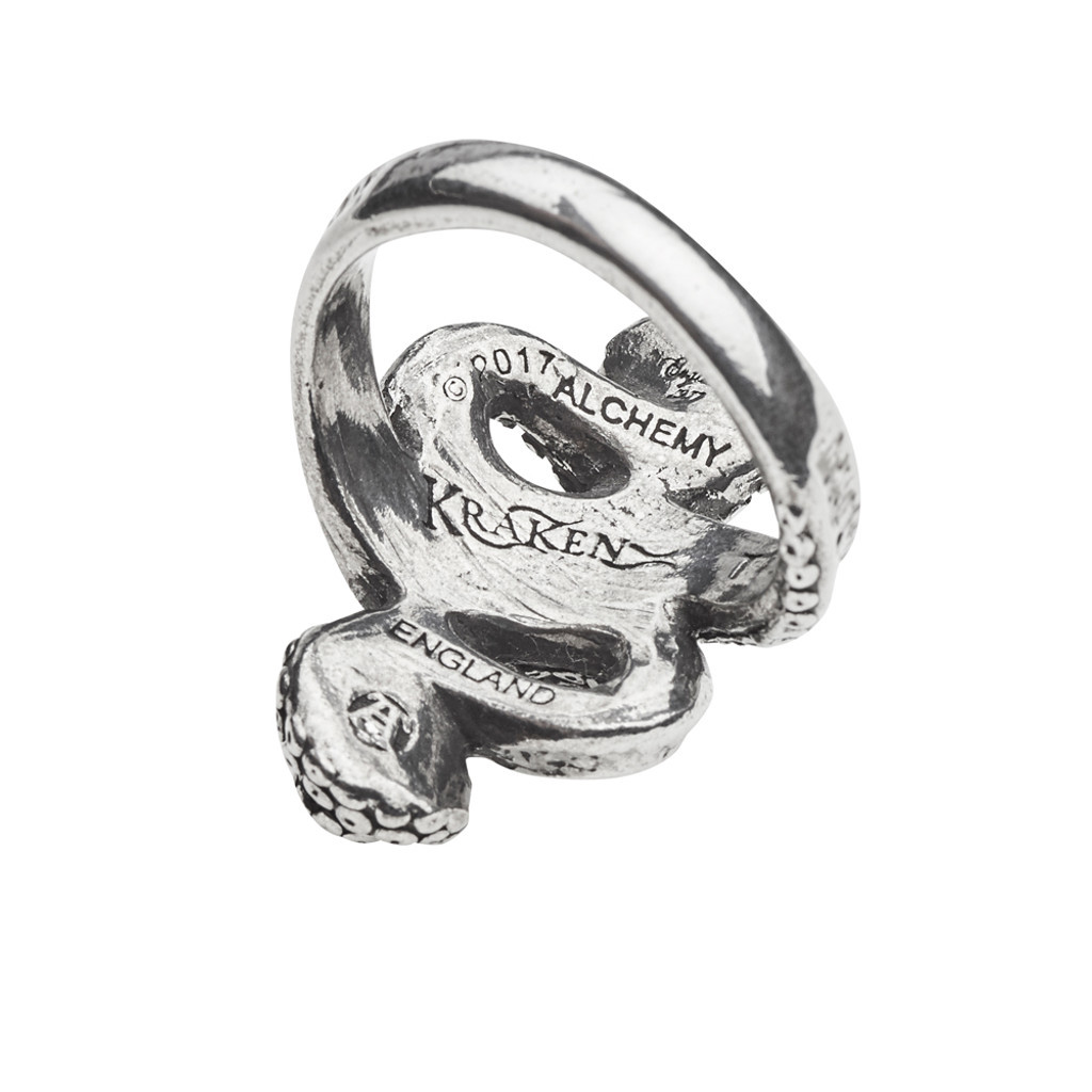 Вы пытаетесь избавиться от ощущения чудовищных, скользких щупалец, пытающихся вцепиться в вашу шею, как это не удавалось бесчисленному множеству людей в таинственных и трагических морских историях. Кольцо из полированного состаренного пьютера, стилизованное под щупальца гигантского кальмара, обхватывает палец.