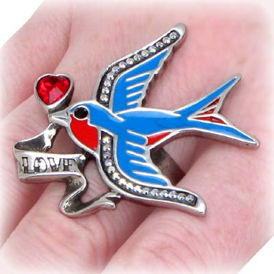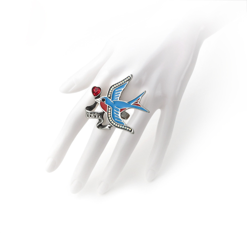 Большое двухцветное эмалированное кольцо «Ласточка» с сердцем из кристаллов Swarovski, хрустальными «нитками» и гравированным свитком «LOVE». Ширина 1,81 дюйма x высота 0,94 дюйма x глубина 1,81 дюйма Прибл.