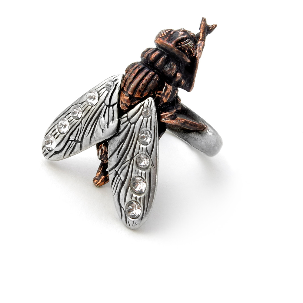 Гигантская муха из черной бронзы с контрастирующими с ее телом отполированными пьютерными крыльями, украшенными австрийскими кристаллами. Размеры примерно 31 мм x 25 мм x 39 мм в самых широких точках Изготовлено вручную в Англии из лучшего английского пьютера без содержания свинца.