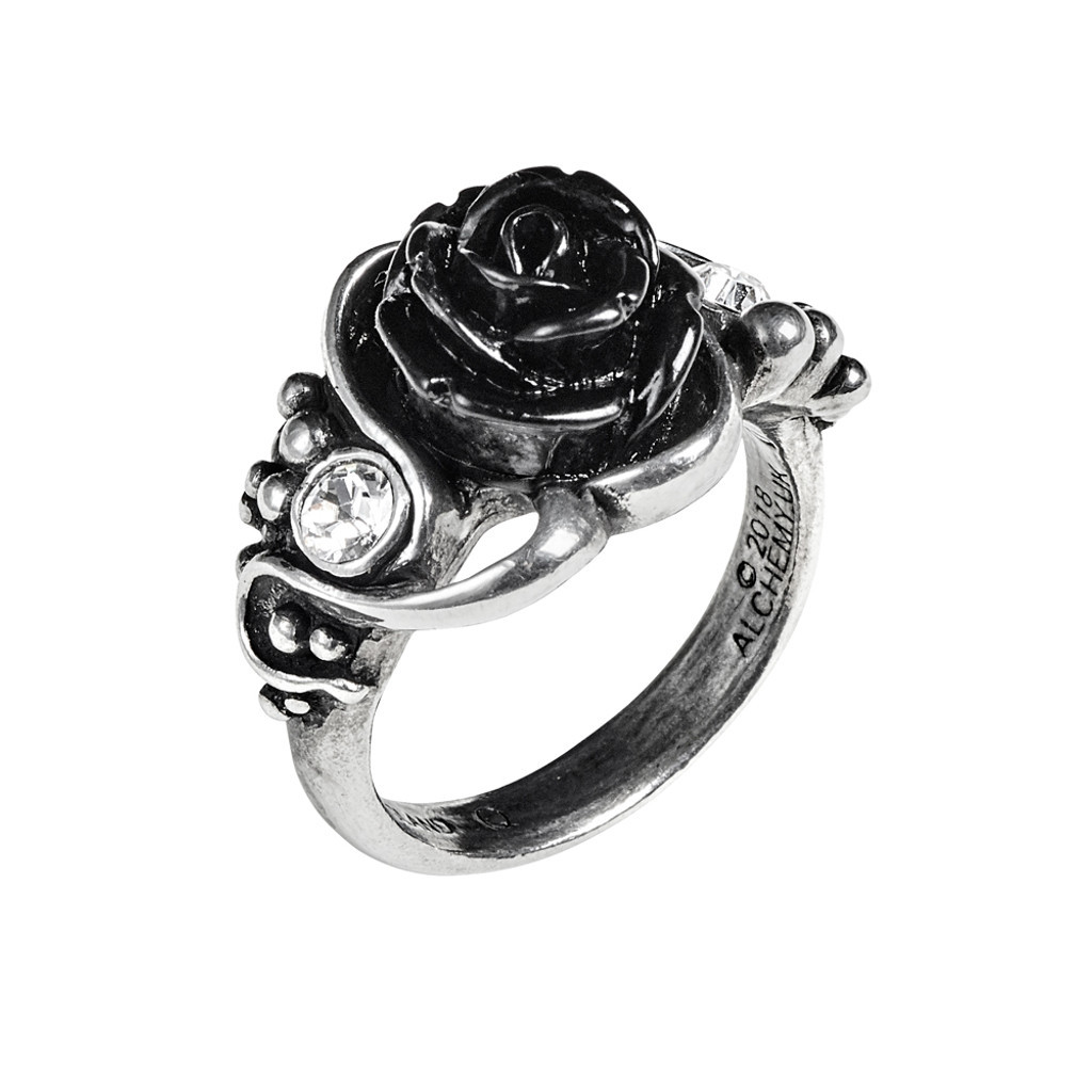 Романтический мотив, скрывающий тайную страсть влюбленного в вино и чувственные удовольствия. Пьянящее сочетание черной розы темного желания и виноградной лозы губительного желания. Кольцо с розой и виноградной лозой из полированного пьютера, в центре - роза из черной смолы, по бокам - прозрачный кристалл австрийского самоцвета.