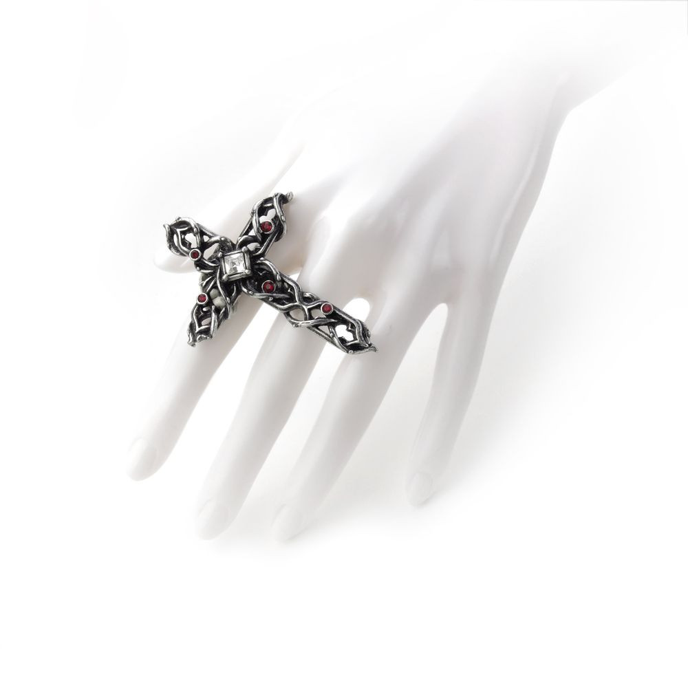 Проникновенная, опутанная вязь креста из хрустальной страсти, окрашенной кровью, и медианного сияния света. Кольцо закрывает все пальцы руки. Украшено австрийскими кристаллами и изготовлено вручную из английского пьютера. Кольцо покрывающее три пальца, в форме креста, сложенного из запутанных узоров, усыпанное кристаллами имитирующих красные капли и украшенное центральным прозрачным кристаллом. Изделия в индивидуальной фирменной упаковке, включающей гарантию и инструкцию по уходу. Разработаны и изготовлены вручную в Англии из английского пьютера.