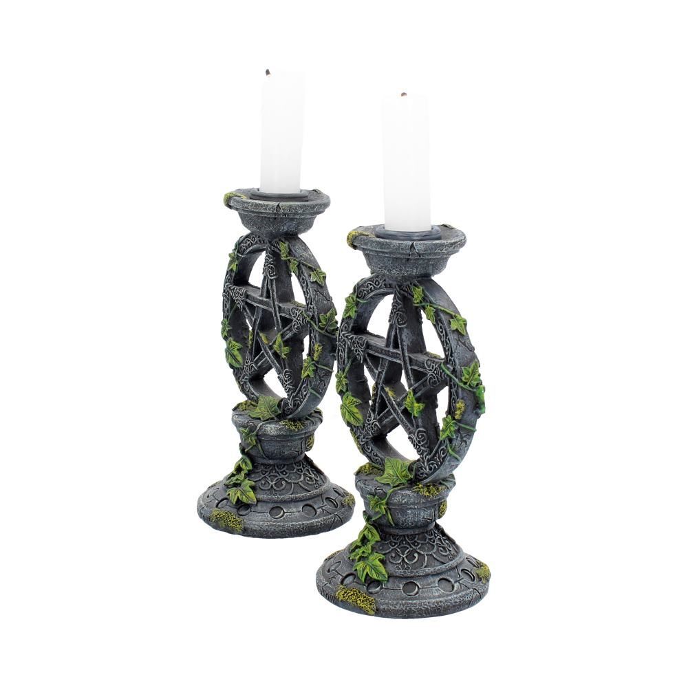 Эта пара подсвечников, увитая вьющимся плющом, идеально подходит для придания магического оттенка любому обеденному столу или гостиной. Созданные компанией Nemesis Now и отлитые из высококачественной смолы, эти подсвечники поднимаются вверх и включают в себя круг, окружающий пентаграмму с лишайником и усиками плюща. Кельтские узоры поднимаются вверх по внешней стороне, а на основании изображены фазы луны. Идеальный для обеденного стола, спальни или алтаря, или просто для того, чтобы приглушить свет и создать более расслабленное настроение, этот набор из 2 подсвечников - прекрасный подарок для мистика или романтика в вашей жизни. 15 см.