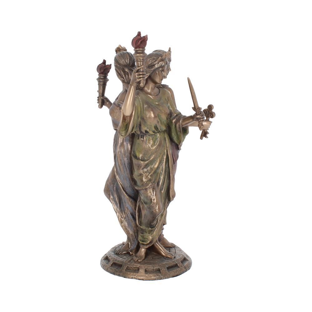 Отлитая из тончайшего полистоуна и покрытая бронзой, эта мистическая богиня представлена в коллекции сувенирной продукции альтернативного бренда Nemesis Now. Геката - богиня в древнегреческой религии и мифологии, чаще всего изображаемая с парой факелов или ключом, а в более поздние периоды изображаемая в тройной форме, как на этой прекрасной фигурке. Она ассоциировалась с перекрестками, входами, светом, магией, колдовством, знанием трав и ядовитых растений, призраками, некромантией и колдовством. Позвольте Гекате осветить ваш путь сегодня. 21 см.