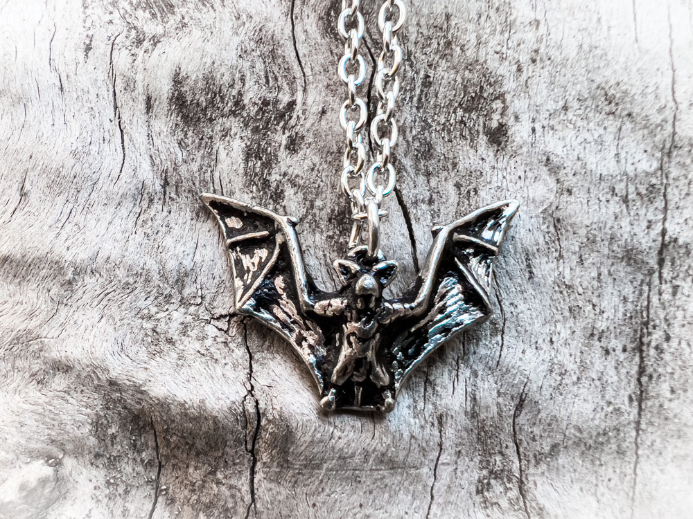 Миниатюрный кулон в виде изображения летучей мыши в полете, выполнен в сером цвете. Размеры подвески составляют приблизительно 20 мм в высоту, 29 мм в ширину и 9 мм в глубину, а вес - всего 7 грамм.
