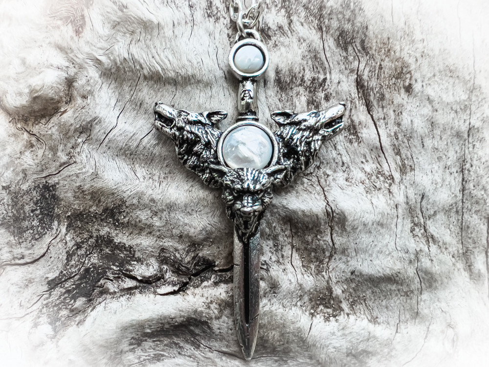Подвеска выполнена в виде головы волка и кинжала с двумя камнями, имитирующими луну. Это придает украшению уникальный и запоминающийся вид.