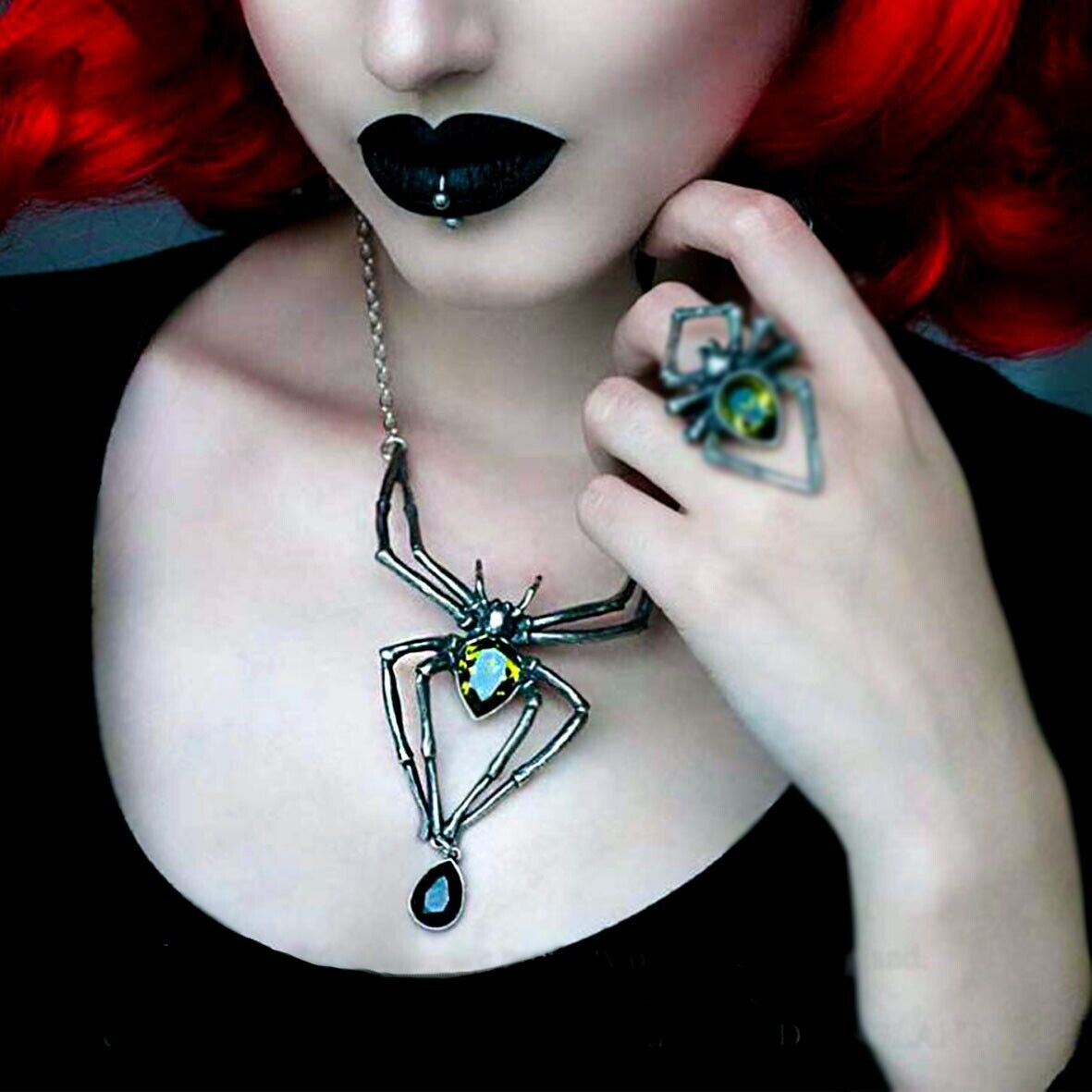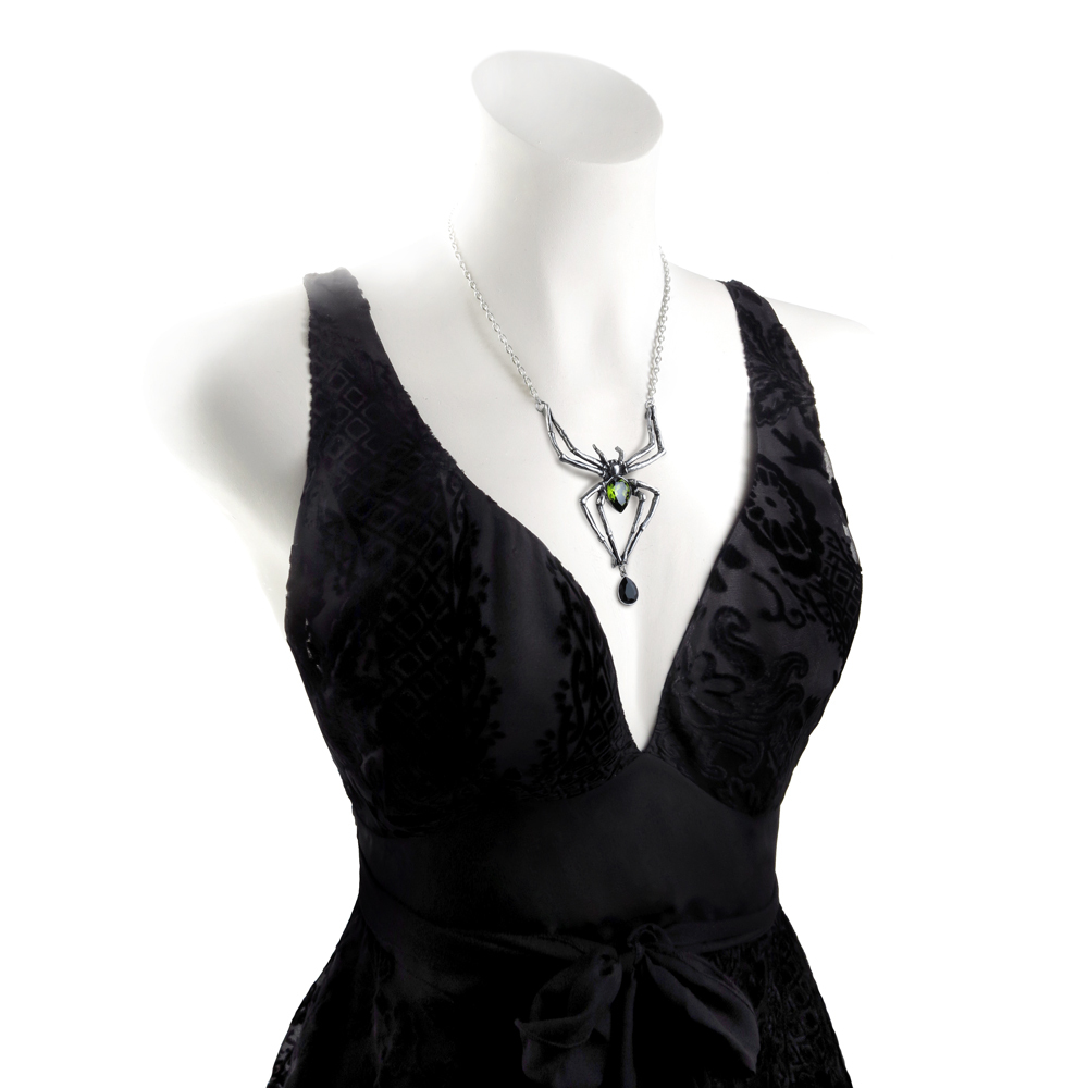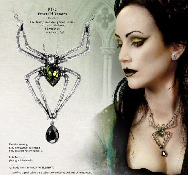 Смертоносный хищник, готовый погрузить свои неотразимые клыки в шею своего хозяина. Захватывающее ожерелье, которое добавит готической драму в любой наряд. Гигантское ожерелье-паук с зелеными и черными кристаллами. Подобное носил Элис Купер. Вес и размеры (приблизительно): H: 110 мм (4,33 дюйма) W: 68 мм (2,68 дюйма) D: 20 мм (0,79 дюйма) Вес 40 г (1,41 унция)
