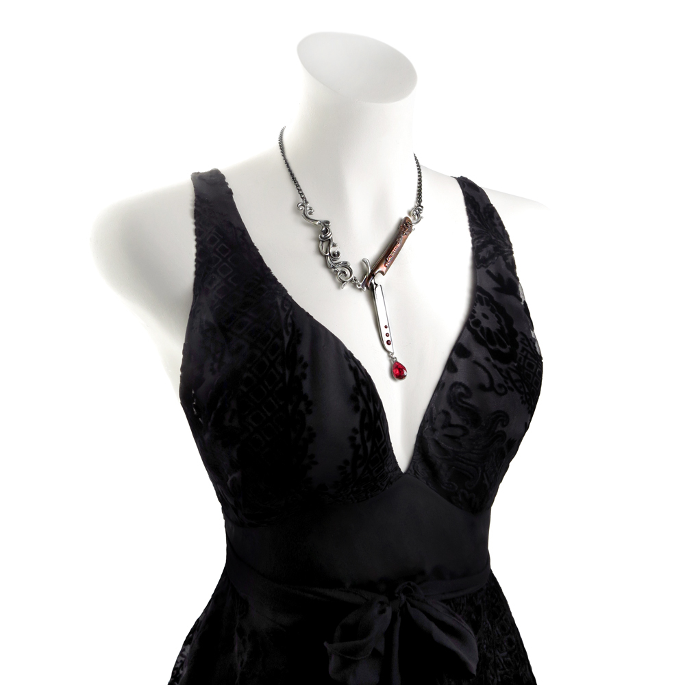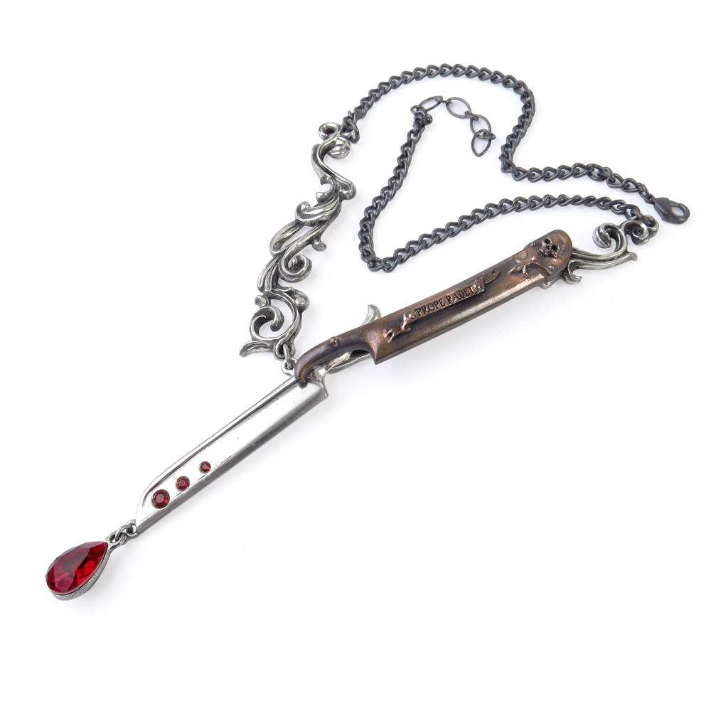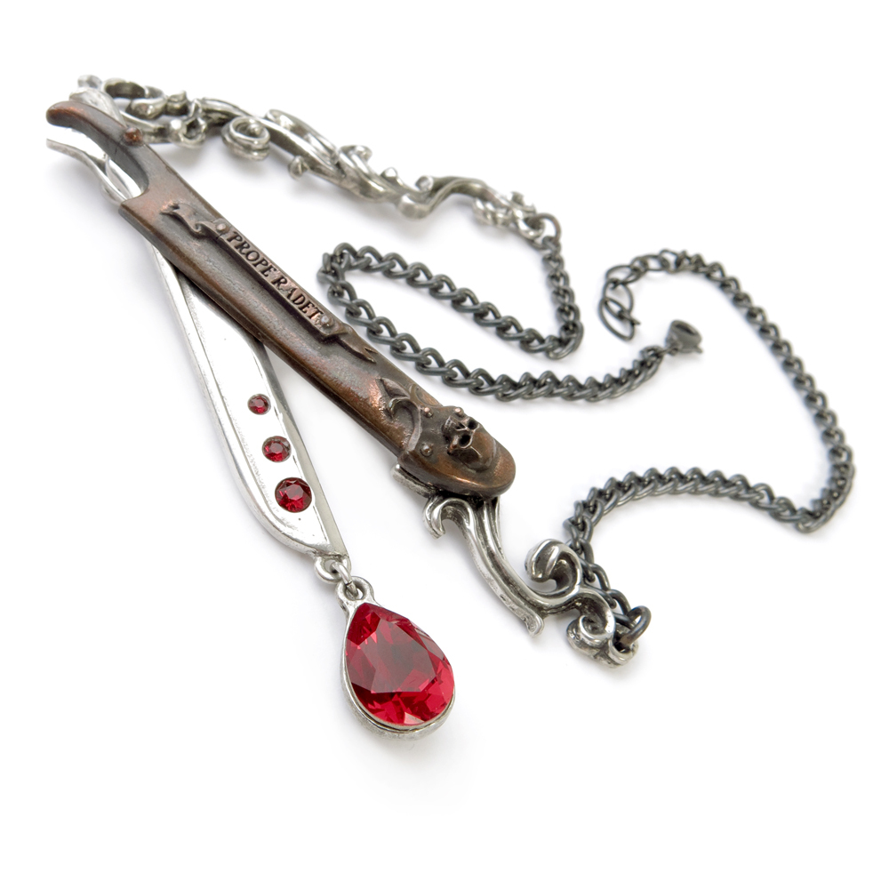 Элегантный, хотя и скромный шедевр от уважаемого изобретателя бритвы 1740 года; надпись propre radet означает тщательное бритье. Артикулированное двухцветное пьютерное ожерелье с кровавыми каплями из кристаллов Swarovski. H: 31 мм, W: 31 мм, D: 0 мм, Вес 0 г. Длина 53 см.
