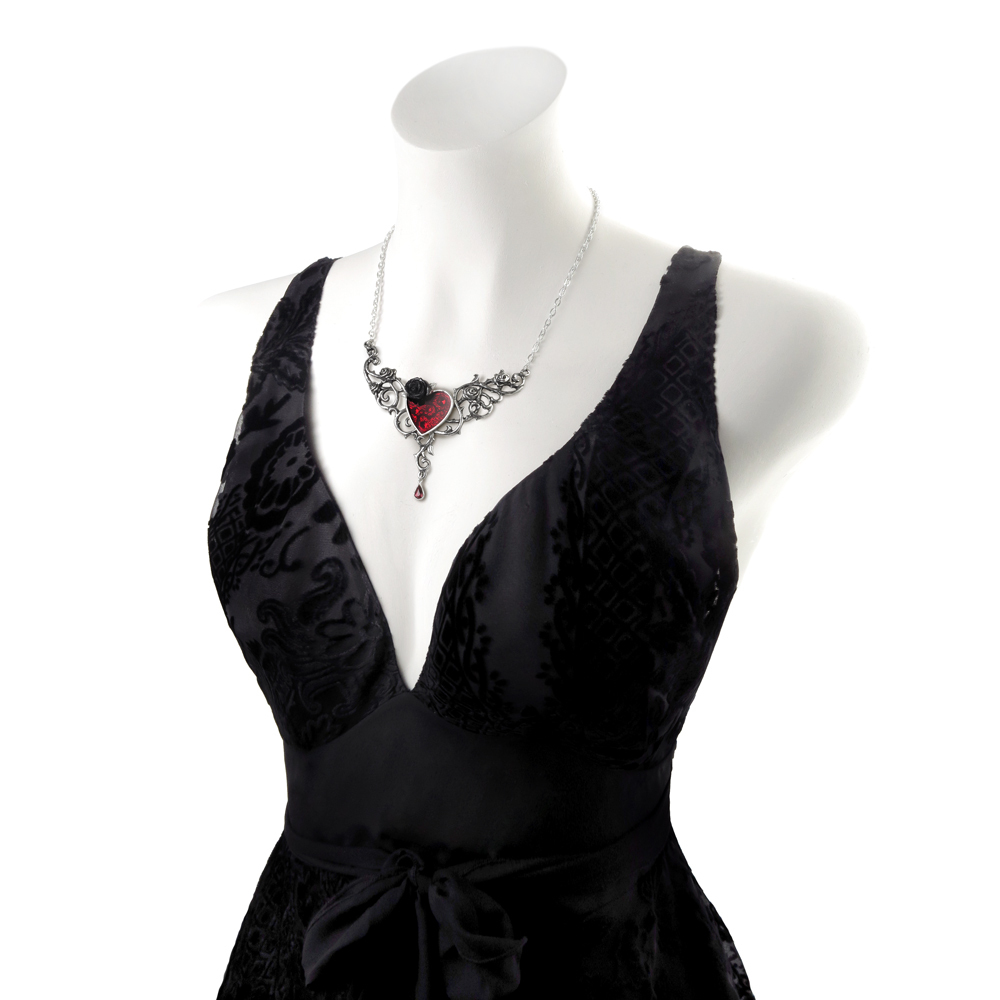 Декоративное ожерелье стилизовано шипами, окружающими красное-эмалированное сердце, с кристаллами Сваровски. Любовь никогда не бывает простой. Темная романтика тайно расцветает из жизненной энергии некогда разбитого сердца; под красной эмалевой кровью скрываются кристаллы Swarovski. Витиеватое ожерелье из переплетенных шипов роз, окружающих прозрачное сердце с красной эмалью, покрывающее  кристаллы Swarovski, увенчанное черной розой и украшенное кроваво-красным кристаллом-каплей. Вес и размеры (приблизительно): H: 88 мм (3,46 дюйма) W: 112 мм (4,41 дюйма) D: 18 мм (0,71 дюйма) Вес 56 г (1,98 унции)