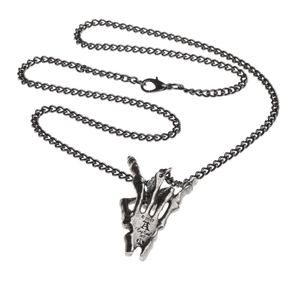 Альтернативная версия жеста "Знак рогов", или по-итальянски "mano cornuta". Популяризированный Ронни Джеймсом Дио из Black Sabbath, "Maloik" или "Malocchio" - "Дурной глаз" теперь является классическим жестом в рок- и металл- стилях. Кулон скелет кисти в жесте традиционного стиля, а так же рок-н-ролльного символа, на 21-дюймовой (53 см) цепочке. Вес и размеры (приблизительно): H: 41 мм (1,61 дюйма) W: 27 мм (1,06 дюйма) D: 13 мм (0,51 дюйма) Вес: 23 г (0,81 унции)