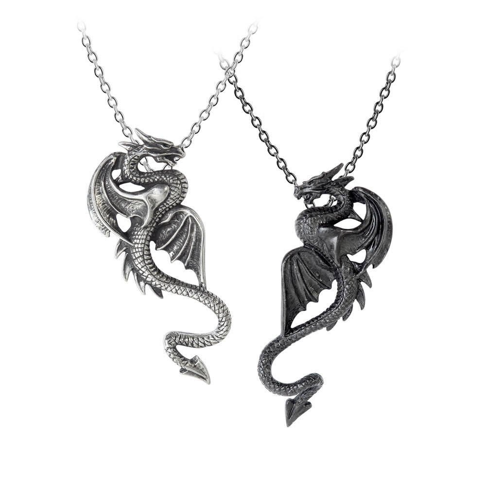 Приверженцы тьмы и партнеры вступают в сговор и переплетаются в несокрушимых объятиях, для того, чтобы навечно принадлежать друг другу. Двухцветное ожерелье, переплетающиеся детали, могут использоваться по отдельности. Два кулона в одном; симметричные зеркальные изображения - драконы, один черный, а другой серый, переплетаются и сталкиваются друг с другом, чтобы сформировать большую форму сердца. Два дракона скрепляются друг с другом скрытыми магнитами и разъединяются, если их потянуть, делая две отдельные подвески на отдельных цепях. На двух отдельных цепочках одна черная, а другая серая, длиной 18 дюймов (46 см). Можно носить вместе или как две отдельные подвески. Вес и размеры (приблизительно): H: 63 мм (2,48 дюйма) W: 53 мм (2,09 дюйма) D: 11 мм (0,43 дюйма) Вес: 41 г (1,45 унции)