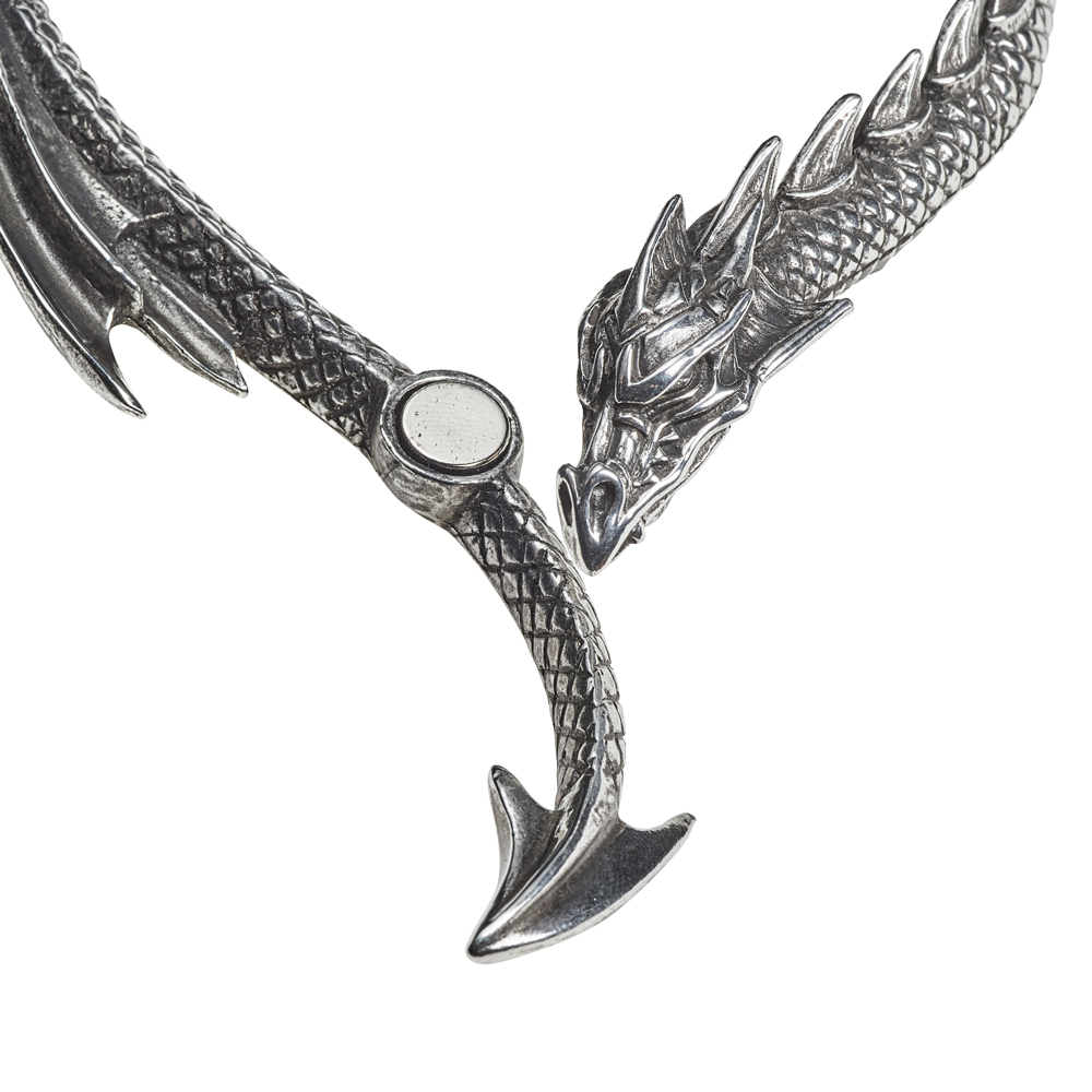 Подвеска Дракон. Подвеска на магнитной застежке, в форме дракона. Извивающийся, уникальный дракон, охотно доверившийся изменчивому образу жизни. Большое цельное, старинное ожерелье в форме дракона,на сплошной змееподобной цепи. Всего 19 ½" (49 см); нерегулируемое. Вес и размеры (приблизительно): H: 145 мм (5,71 дюйма) W: 96 мм (3,78 дюйма) D: 18 мм (0,71 дюйма) Вес: 159 г (5,61 унции)