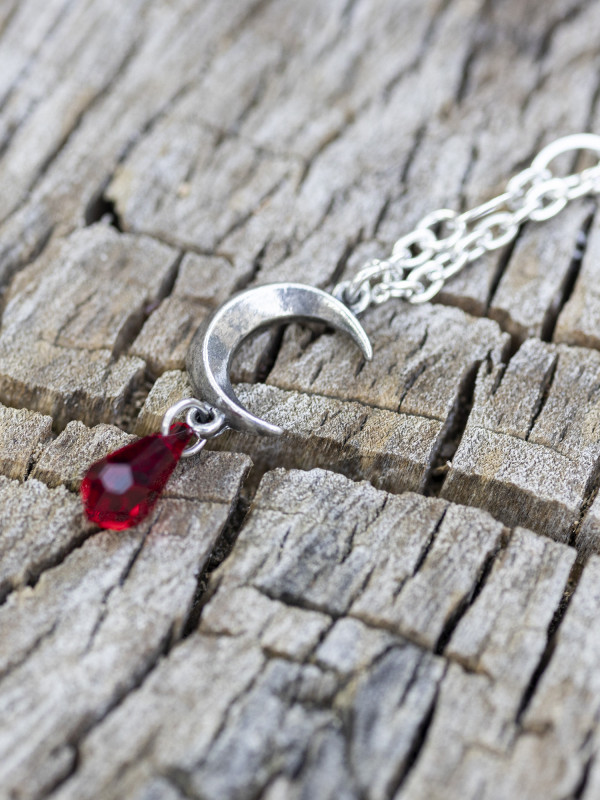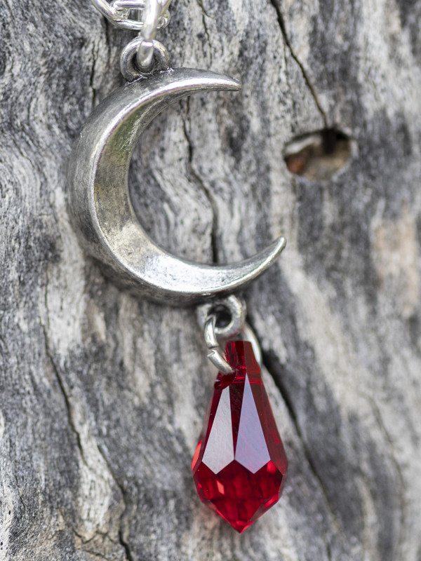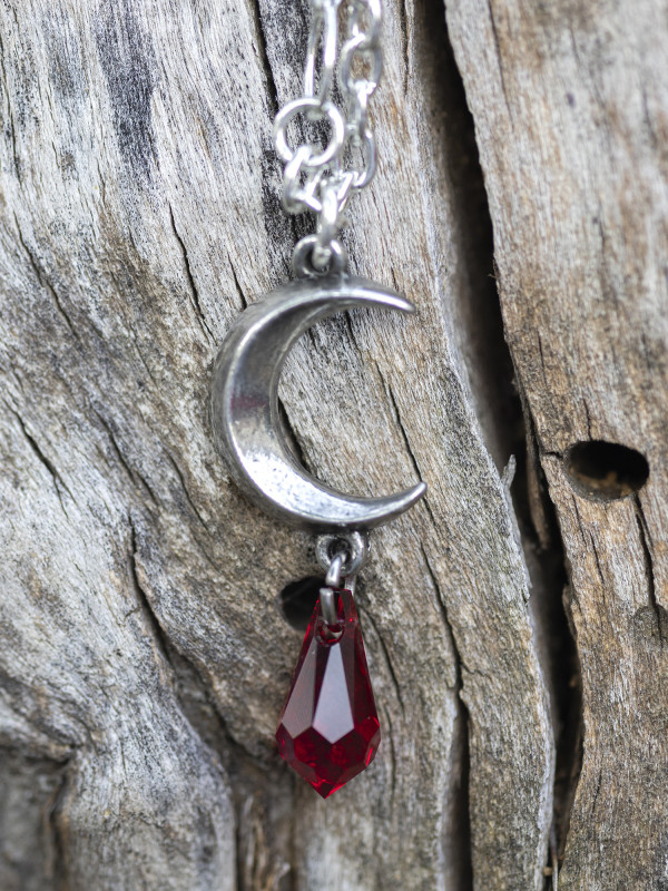 Изящный полумесяц из тончайшего английского пьютера удерживает алую каплю сверкающего кристалла австрийской огранки, словно кровь охоты, впитавшая в себя магию ночного леса и древние ритуалы выживания. Этот эффектный аксессуар станет украшением для тех, кто идёт вперёд, опираясь на свою интуицию, силу духа и первозданную энергию.